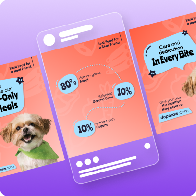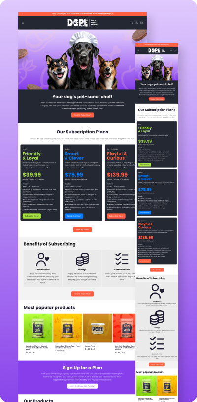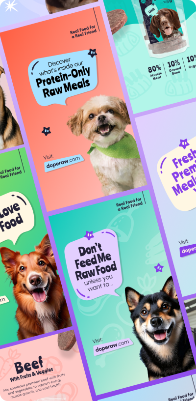 Dope Raw is a Calgary-based pet food company focused on natural, raw nutrition for pets. I led the creative direction across multiple touchpoints, from packaging design and print materials to monthly content planning and the development of a Shopify website designed to convert traffic and meet KPIs. The result was a bold, dynamic brand presence that resonates with customers both online and in-store, bringing a fresh, engaging voice to Dope Raw’s visual communication across digital platforms and printed collateral.